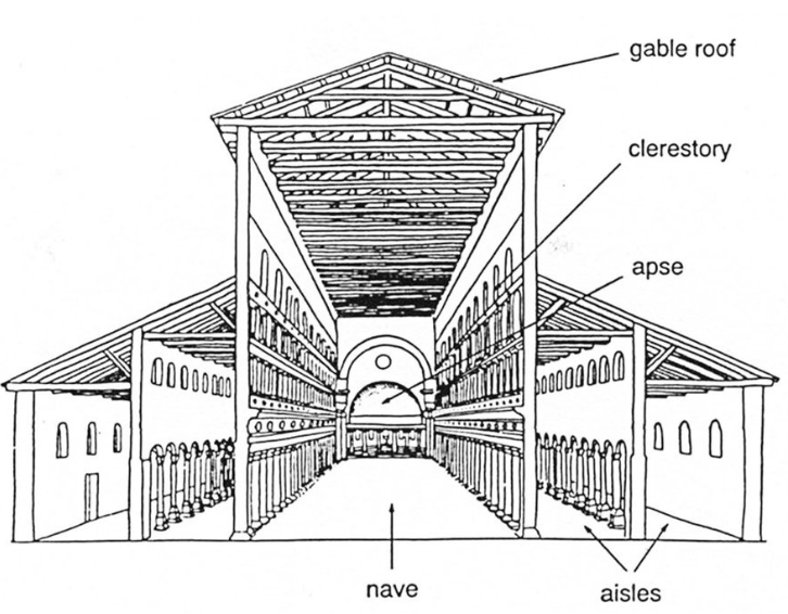 바실리카식 교회는 콘스탄티누스 황제가 사도 베드로를 묻은 무덤 위에 성 베드로 (San Pietro: 바티칸) 대성당)을 세움으로서 시작된다. 원래 바실리카는 로마 시대의 법정이나 상업거래소 또는 집회장과 같은 용도로 사용된 긴네모꼴 평면의 공공건물이었으나 콘스탄티누스 황제가 이것을 교회 건물로 채택하면서 바실리카식 교회의 바탕꼴이 되었다. 특히 바실리카는 무엇보다도 그리스도교 의식에 알맞은 넓고 높은 내부공간을 가지고 있고 그 규모가 국가 종교에 걸맞는 위용과 위엄을 갖추고 있었기 때문에 많은 사람이 집회를 하기 위한 장소로서는 로마 시대의 건축물의 유형 중에서 적합했다. 바실리카 교회의 기본형식은 성당으로 들어가는 앞부분에 로마 주택의 마당과 같은 아트리움이 있고, 본당입구에 안과 밖을 구분하는 전이공간인 나르텍스(nartex : 현관과 비슷한 공간)를 갖고 있다. 안으로 들어서면 네이브(nave: 회중석)와 마일(aisle: 복도)로 구성된 전례공간이 나타나는데, 이 때 네이브 벽면은 열주로 된 아케이드 (arcade: 열주로 구성된 복도)와 클리어스토리(clearstory: 높은 창문)로 짜여진다. 그리고 안쪽 끝 부분에는 반원통형으로 된 엡스(apse: 제단)가 덧붙여진다. 그 한가운데는 주교가 앉는 자리 카테드라(cathedra)가 있고, 그 왼쪽과 오른 쪽에는 사제(신부)가 앉는 자리가 있다. 뒷날 주교좌가 있는 곳을 성당(cathedral), 일반 사제만 있는 곳을 교회(church, eglise)라 부르는 까닭이 여기 있다.