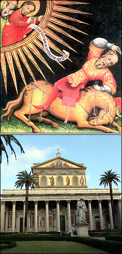 ▶ 다마스커스로 교회를 박해하러 가던 중 예수 그리스도를 만나 회개하는 바오로 사도를 표현한 그림. ▶ 성 바오로 대성당. 로마의 4대 대성전 중의 하나로 사도 바오로의 무덤 위에 세워졌다. | 이방인들의 사도라 불리는 바오로 사도. 그는 세 차례에 걸쳐 광범위한 전도 여행을 했다. 이러한 노력으로 민족적·지역적 종교가 인류 전체를 향한 세계 종교로 탈바꿈했다.
